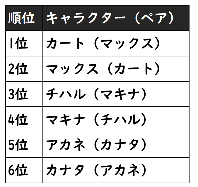 人気No.1は、圧倒的な大差で元陸軍出身のサイボーグ、他人に無関心な超クールキャラ「カート」。2位は、そのカートの相棒「マックス」。チハル&マキナコンビが続き、アカネ&カナタとなりました。