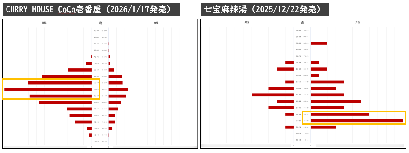 たとえば、26年1月発売の「CURRY HOUSE CoCo壱番屋」では、購入者の約8割が男性。中心となるクラスタは50代前半をピークとした40代後半〜50代と明確で、ココイチに根強い中高年男性ファンの存在がそのままデータに表れている。一方、25年12月に登場した「七宝麻辣湯」は正反対。購入者の約7割が女性で、ピークは20代後半、次いで30代女性が続く。ヘルシー志向や“麻辣ブーム”を支える若い女性層が、ファンブックでもそのまま主役になっている。