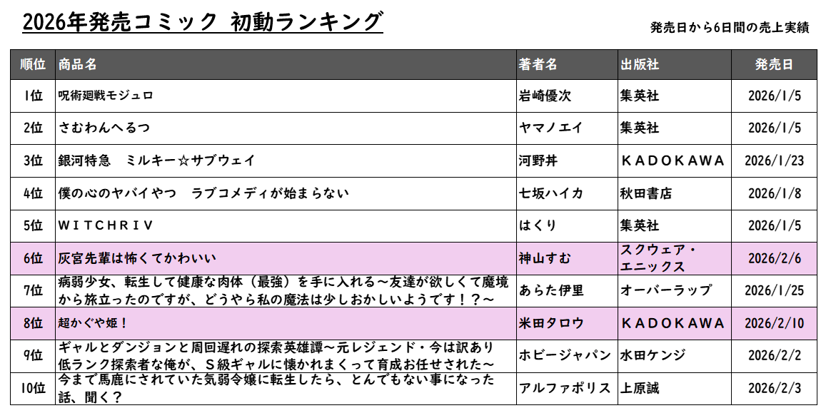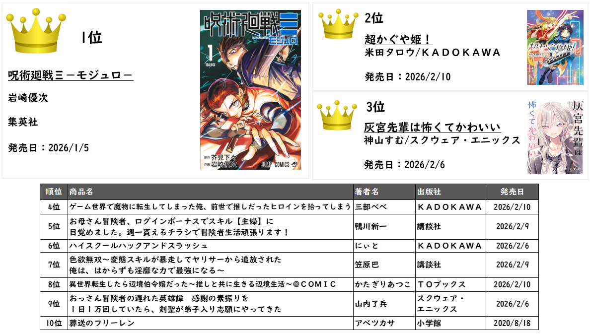 先週のコミック1巻ランキングの4~9位は、異世界系コミックの新刊が軒並みランクイン!その上位であるTOP3は、1位は、引き続き根強い人気『呪術廻戦』の “68年後の未来” を舞台にした公式スピンオフ作品「呪術廻戦Ξ-モジュロ-」/岩崎優次(集英社)。2位は、Netflixで独占配信されたオリジナルアニメ作品のコミカライズ版「超かぐや姫!」/米田タロウ(KADOKAWA)が初登場。3位は怖くて優しい先輩の胸きゅんラブコメ「灰宮先輩は怖くてかわいい」/神山すむ(スクウェア・エニックス)がランクイン。出版POSデータ分析ツール:CANTERA調べ(2026年2月9日~15日)