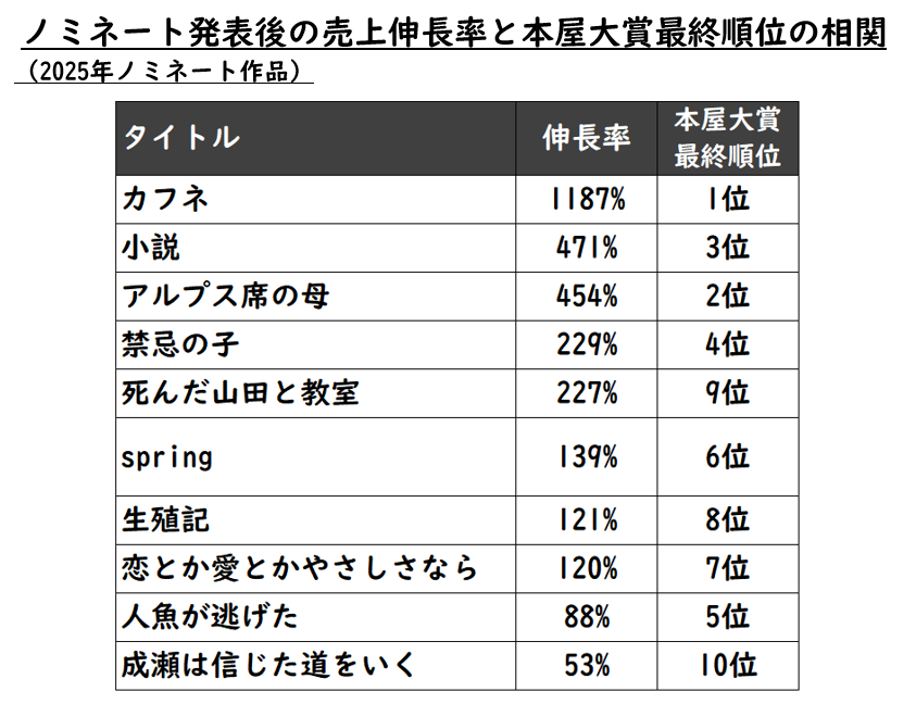 しかし興味深いのは、大賞発表以前に“市場のほうが先に兆しを示す”ケースが存在する点だ。昨年(2025年)はまさにその典型だった。ノミネート発表後の販売データを振り返ると、売上伸長率トップは 『カフネ』。続いて 『小説』(野崎まど/講談社)、僅差で 『アルプス席の母』(早見和真/小学館)、4位に 『禁忌の子』(山口未桜/東京創元社) が続いた。