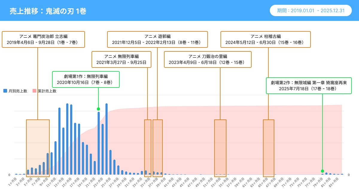 その後、2020年公開の劇場版「無限列車編」のタイミングで、再び山を形成します。映画の公開を皮切りに、原作マンガの売上が大きく伸びていることが確認できます。