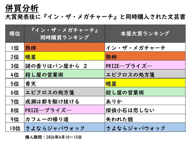 もうひとつ、面白い動きがありました。大賞発表後に『イン・ザ・メガチャーチ』を購入した人が、一緒にどんな本を買ったのかを見てみると、その多くが本屋大賞の上位作品だったのです。